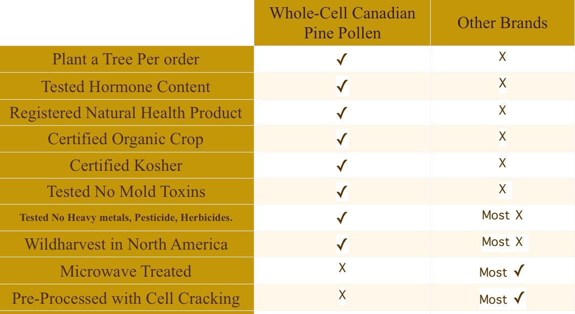 We don't crack our whole cell pine pollen, unlike imported pollen from masson pine and tabuliformus pine. Cracking exposes the pollen nutrients to air and light, leading to oxidation. It is proven that fresh pollen is more potent. So our pollen is always fresh - never heat-treated, UV irradiated, ethylene oxide, gas, or microwave sterilized, as compared to imported varieties of cracked cell pine pollen.