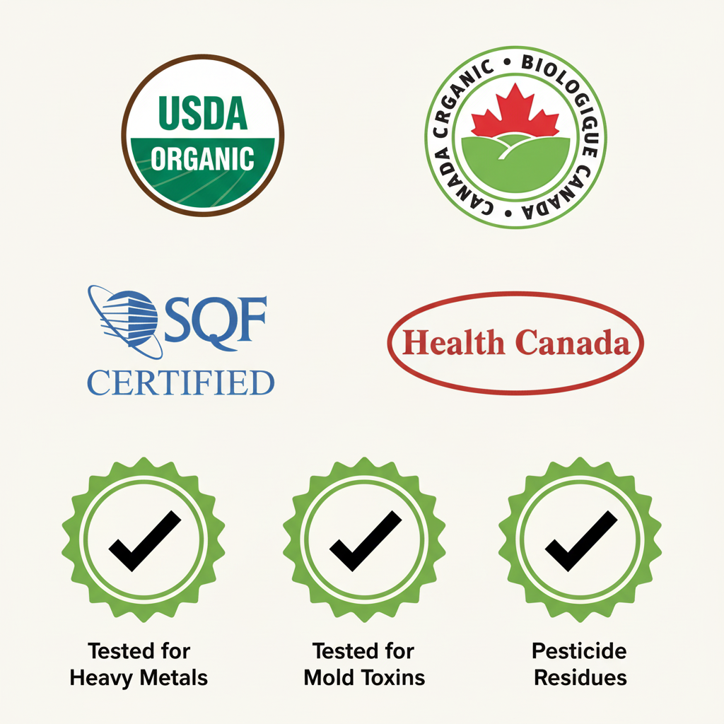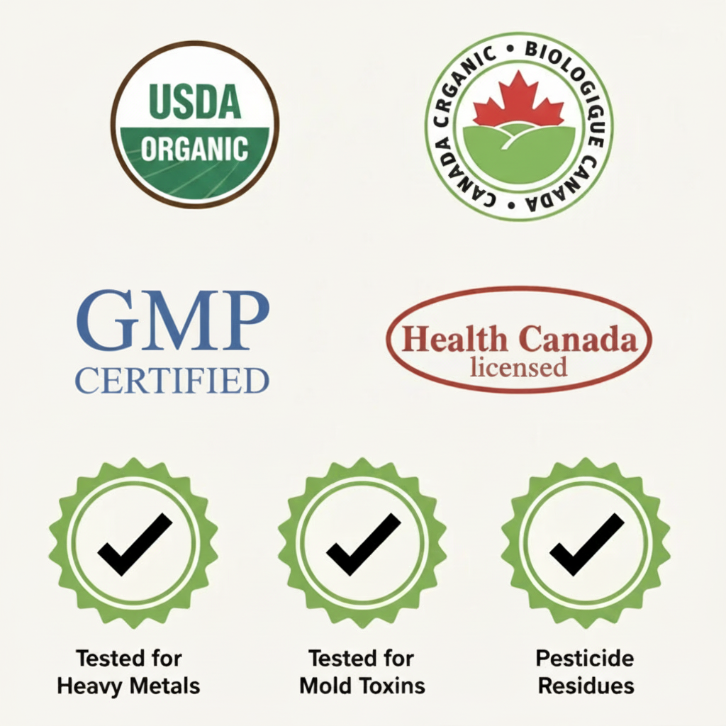 All our products are Certified Organic, Kosher, GMP, HACCP, and ISO certified and made in a facility licensed by Health Canada. We tested our products for heavy metals, pesticides, herbicides and mould toxins with third-party labs.