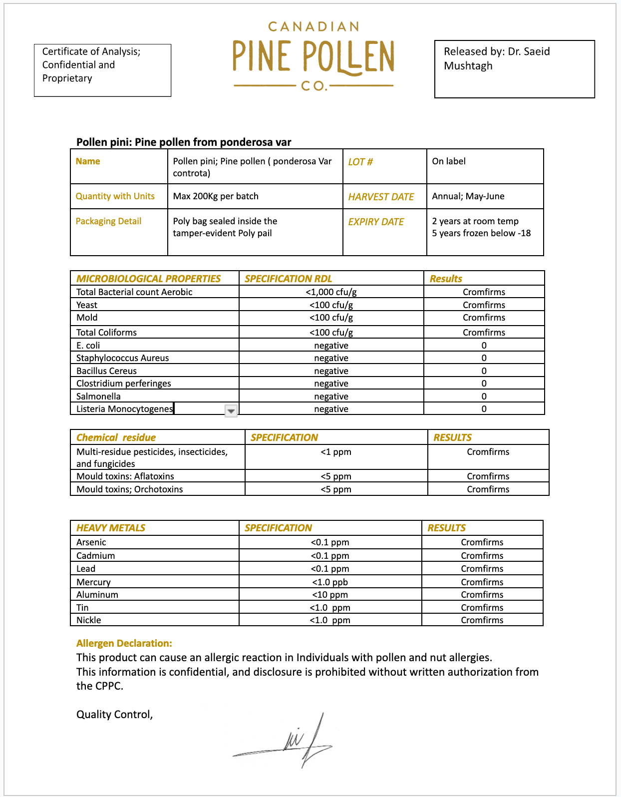 Our Canadian wild harvested pine pollen tinctures are first in class Health Canada approved supplemtns.